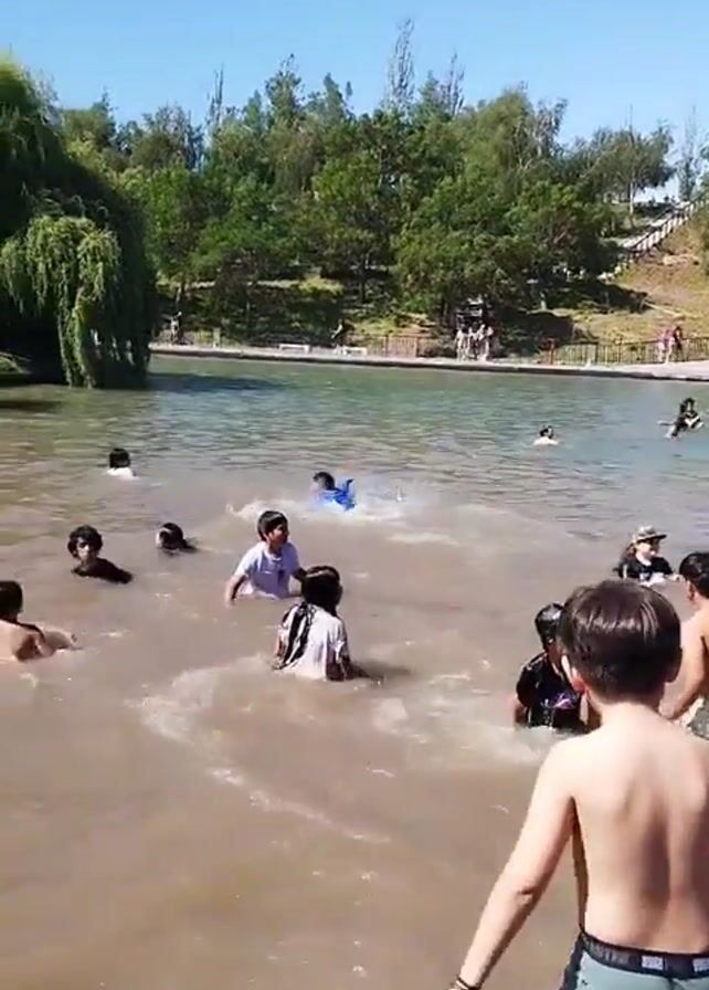 The video captures a lively scene of approximately a dozen children swimming and playing in a murky, muddy-looking lake on a bright, sunny day. The water is shallow enough for most of the kids to stand, and they are splashing and moving around. On the edge of the water, a couple of kids stand watching, one of them shirtless and wearing green underwear. In the background, beyond the lake's edge, are trees and a walking path, with more people visible further away. The environment looks like a public park or recreational area.