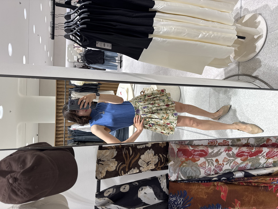 A woman with short, dark, wavy hair is captured in a mirror selfie within a retail clothing store. She wears a sleeveless blue mock-neck top, a pleated, cream-colored mini-skirt with a multicolored floral pattern, and pointed-toe beige flats. Her left hand rests on her hip, while her right hand holds a dark-colored smartphone, used to take the photograph. She accessorizes with a silver-toned necklace, a ring on her left ring finger, and a white wristwatch on her left wrist. The environment reflects a modern retail space with bright overhead lighting. Behind the woman, clothing racks display various garments including denim and light-colored items, with wooden wall panels visible in the background. To the left of the mirror, a black clothing rack holds a brown baseball cap and multiple rolls of patterned fabric or scarves featuring floral and abstract designs in various colors. To the right of the mirror, another black clothing rack displays identical two-tone garments, each consisting of a black sleeveless top attached to a cream-colored pleated skirt portion. The floor appears light-colored and reflective. The specific store location within Dubai, United Arab Emirates, cannot be definitively identified from the image, but it depicts a common scene within a large shopping mall or department store.