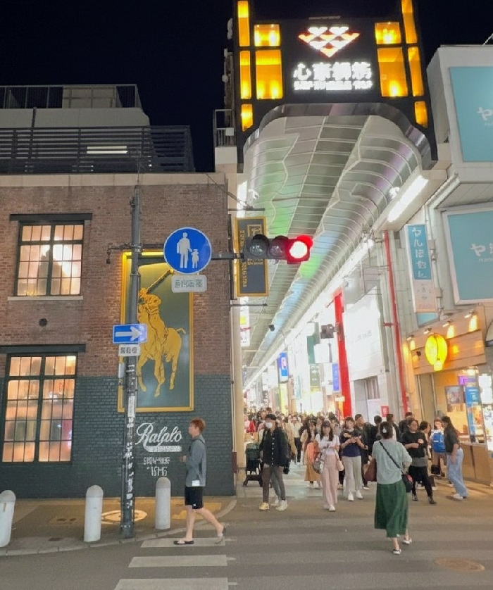 The image depicts a bustling nighttime street scene at the entrance to the Shinsaibashi-suji shopping arcade in Osaka, Japan. On the left, a multi-story brick building with illuminated windows features a large vertical sign displaying a golden polo player on a horse logo, with "Ralph's" text visible below. A light pole in front of the building holds a circular blue pedestrian crossing sign and a rectangular blue directional arrow sign. White bollards line the sidewalk. A pedestrian, dressed in a grey hoodie, black shorts, and dark sandals, walks from left to right across a marked crosswalk in the foreground. To the right, the entrance to the Shinsaibashi-suji shopping arcade is prominent, identified by a large illuminated sign featuring Japanese characters "心斎橋筋" (Shinsaibashi-suji) and a geometric logo. A traffic light positioned beneath this sign displays a red signal. The arcade interior is brightly lit, revealing numerous storefronts and a dense crowd of pedestrians. People are walking in various directions, populating the covered walkway. One individual near the center of the crowd wears a dark jacket and a face mask, pushing what appears to be a cart or stroller. Another person, seen from behind in a green skirt and light top, walks towards the arcade entrance. The sky above is dark, indicating night, with artificial lighting illuminating the entire scene.