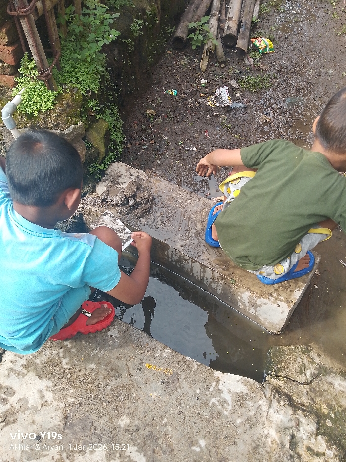 - "Two young boys are squatting on the edge of a concrete water channel, peering into the murky water" by FM-bXIMf1, licensed under CC BY 4.0