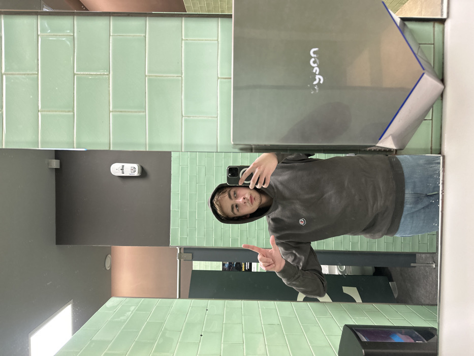 A person in a grey hoodie takes a selfie in a bathroom mirror. The bathroom has light green tiles on the walls, with grey sections. A Dyson hand dryer is mounted on the wall. The person holds up two fingers in a peace sign. The bottom portion of the mirror reflects bathroom stalls. A soap dispenser is visible on the bottom right of the mirror. The person's hood is up.