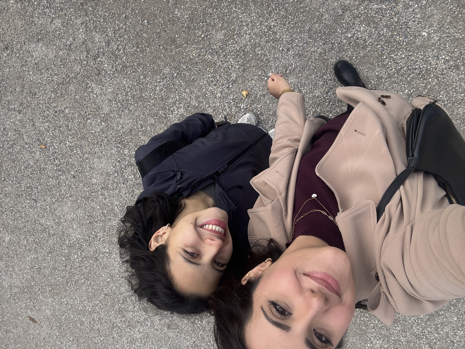 The image displays two women positioned closely together, viewed from an overhead perspective on a paved surface. Both individuals are looking upwards towards the camera and smiling. The woman in the foreground has dark hair, dark eyes, and a light complexion. She is wearing a light beige trench coat over a dark maroon top. A gold chain necklace with a small white, heart-shaped pendant is visible around her neck. Multiple small gold earrings adorn her ears. A black shoulder bag with a visible strap rests on her right side, and a black shoe is visible on her left foot. Her left hand, partially visible on the right side of the frame, displays light-colored fingernail polish. The second woman, positioned behind and slightly to the left of the first, has dark, curly hair, dark eyes, and a light-to-medium complexion. She is wearing a dark blue or black puffer jacket over a grey garment. Multiple ear piercings (studs and small hoops) are visible on her left ear, along with a hoop nose ring. She smiles widely, revealing her teeth. White or light grey sneakers are visible on her feet, and a black strap, consistent with a backpack or shoulder bag, is visible over her right shoulder. The environment consists of a light grey, coarse-grained paved surface, resembling gravel or fine asphalt, which occupies the majority of the frame. A few scattered dry leaves are present on the ground. No identifying landmarks or architectural features are visible within the image to pinpoint a specific location within Vienna, Austria.