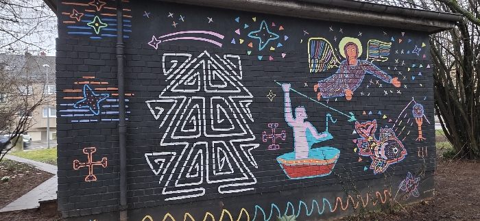 A black brick wall is adorned with vibrant graffiti. On the left, a large geometric tree-like shape dominates. To the right, an angel figure floats above a person in a red boat, holding a fishing line towards an intricately decorated fish. Stars and geometric patterns are scattered across the wall, adding to the colorful and whimsical scene. A building and trees are visible in the background, hinting at an outdoor urban setting.