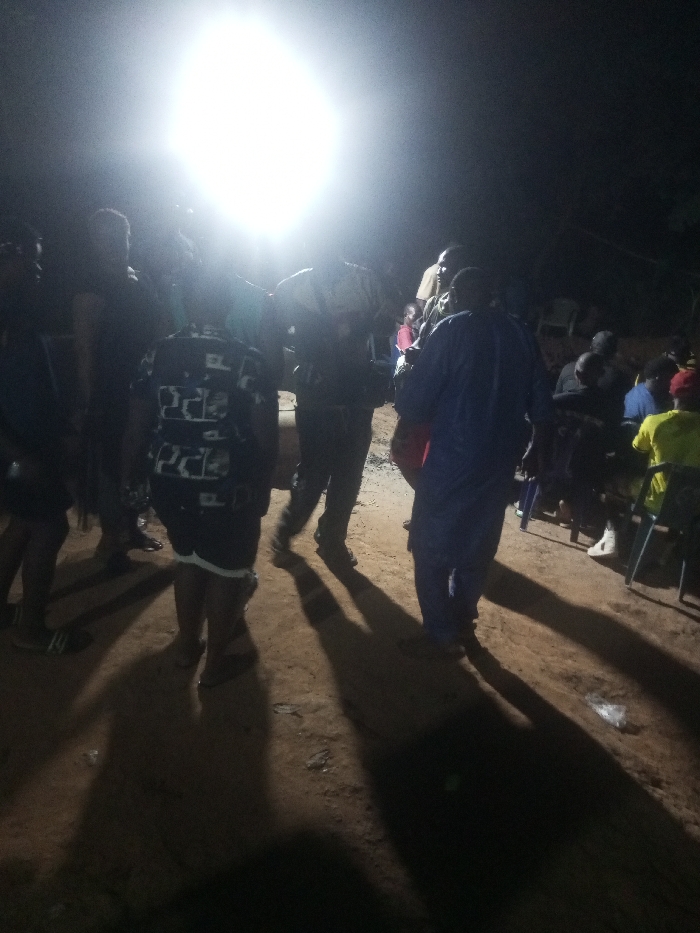 A group of people stand together outdoors at night under a bright light. Some are standing, and others are sitting on chairs. The light casts long, dark shadows on the ground. One person wears a blue robe-like garment, while another wears a patterned shirt and shorts. Details are hard to discern due to the strong contrast between light and shadow.
