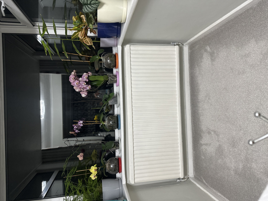 The image displays an indoor scene within a room located in Lancaster, United Kingdom. A wide window sill is lined with ten potted plants. From left to right, these include: a green fern-like plant in a grey pot, a yellow orchid in a clear glass bowl with a red saucer, a small green plant in a clear glass pot, a purple orchid in a clear glass bowl with a blue saucer, a small green plant in a grey pot with a white saucer, a pink orchid in a clear pot with a pink saucer, a brown-hued orchid in a clear glass pot with an orange saucer, a tall green plant in a light purple pot, a Croton plant with variegated foliage in a dark blue pot, and a patterned-leaf plant in a cream-colored pot. Multiple orchids are stabilized by slender support stakes. Below the window sill, a white, horizontally ribbed central heating radiator is installed against the wall. The surrounding walls are light grey, accented by white baseboards, and the floor is covered with light grey carpet. The window glass exhibits reflections of the interior space, notably a rectangular ceiling light fixture. No persons are visible within the frame.