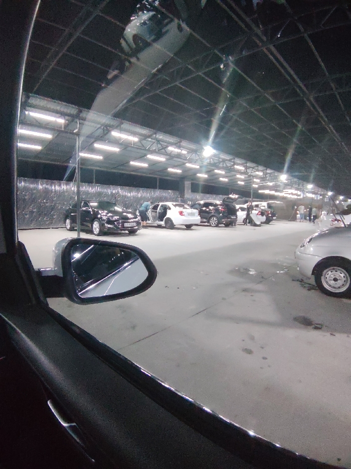 The image depicts an indoor vehicle service facility, likely a car wash or detailing center, located in Navoiy City, Uzbekistan, observed at night. The perspective is from inside a stationary vehicle, looking out through the front passenger window; the vehicle's side mirror is prominent in the lower left foreground. The facility features a large, dark, arched metal truss roof system, illuminated by numerous rectangular fluorescent light fixtures arranged in rows. The back wall appears to be covered with a textured or reflective material. The floor is concrete, exhibiting various wet patches and puddles. Multiple vehicles are present. In the mid-ground, from left to right: a black sedan is parked; a white sedan has its driver's side door open, with an individual leaning into the vehicle's interior; a dark SUV or crossover has its trunk open, with an individual standing near it; and another white sedan is visible further back, surrounded by additional individuals. In the far right foreground, the front passenger side wheel and fender of a silver or light-colored vehicle are partially visible. Several other individuals are scattered throughout the facility, appearing to interact with or stand near the vehicles. The scene is artificially lit, indicating nighttime operations.