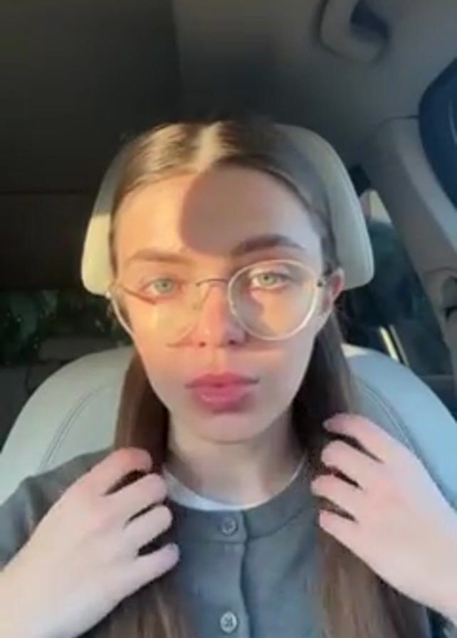 A young woman with long brown hair, parted in the middle and styled in pigtails, sits in the driver's seat of a car. She wears round, gold-rimmed glasses and a gray cardigan over a white top. Sunlight streams into the car from the front, highlighting her face. The car's interior features light-colored leather seats. She is looking directly at the camera, pursing her lips slightly, and briefly touches her hair. The background shows the car's dashboard and the side window.