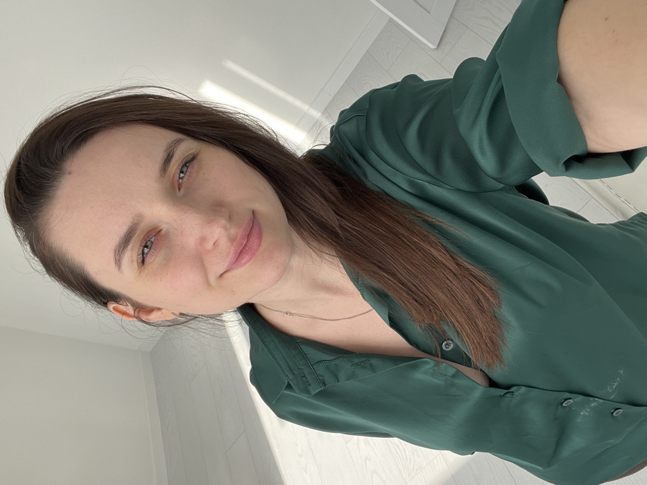 An adult female is depicted in a selfie within an interior room in Tyumen, Russia
