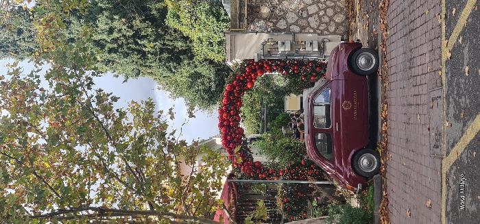 An outdoor scene in Kifisia, Greece, depicts a vintage maroon Fiat 500 parked on a brick-paved surface alongside a street. The vehicle faces right, displaying a gold-colored emblem on its passenger door. The ground exhibits scattered dry, brown leaves, indicative of autumn, and features a section of asphalt with faded yellow parallel lines and a metal utility cover. Behind the car, an ornate archway, heavily adorned with dense clusters of red spherical ornaments and green foliage, marks an entrance or pathway. To the immediate left of this arch, additional red decorations and string lights are visible within dense greenery. The right side of the entrance is bordered by a stone wall featuring multiple gray utility meters. In the background, a light-colored building with a red awning is partially visible through the foliage on the left. The scene is dominated by various trees and shrubs, including deciduous trees with sparse, brownish-green leaves in the upper left quadrant and tall, dark green conifers on the right. The sky is partly cloudy, with a mix of blue and gray clouds. No individuals are present, and no actions or interactions are depicted.