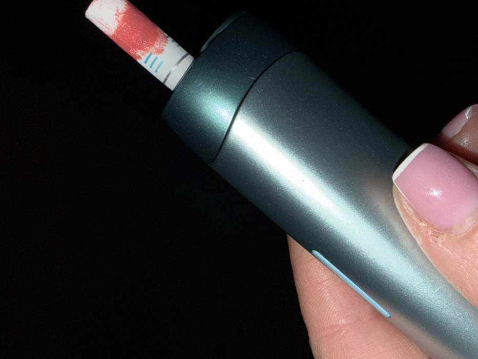 - "The image displays a close-up, angled view of a human hand holding a teal-colored, metallic, cylindrical electronic heated tobacco device against a uniformly black, featureless background" by FM-zcZ6x1, licensed under CC BY 4.0