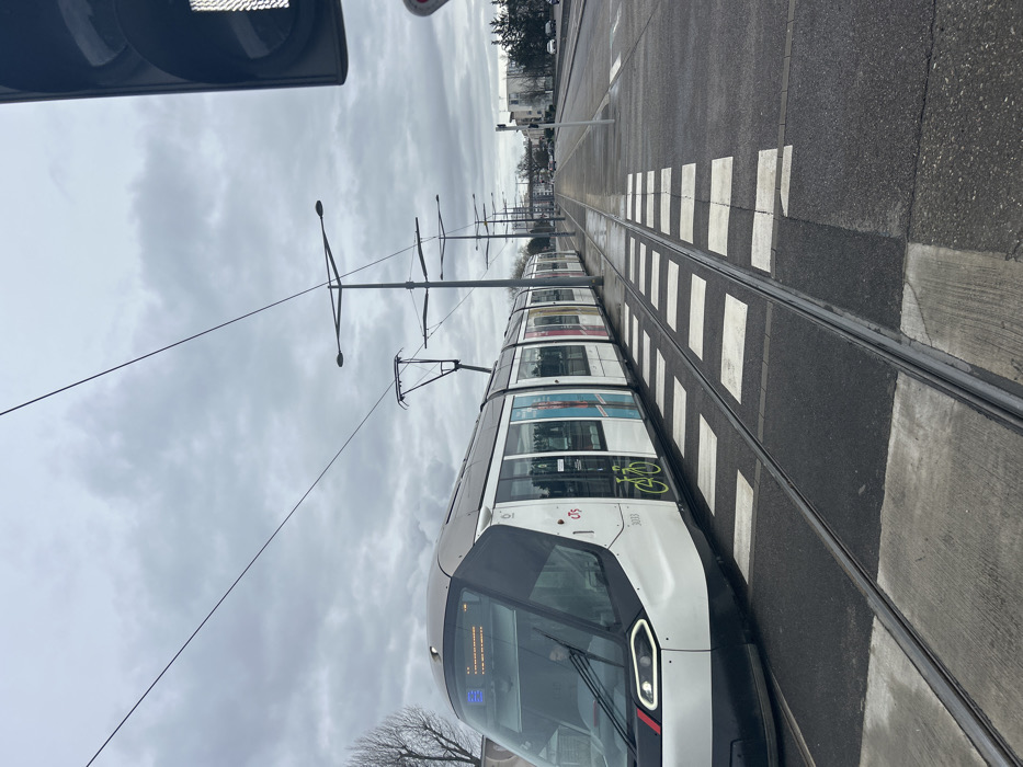 The image displays an urban street scene in Hœnheim, France, under an overcast, grey sky. A white and grey articulated tram, identified by "CTS" branding and the number "3033," is stationary on double tram tracks. The tram's sides feature multi-colored graphic advertisements, including a prominent lime green bicycle symbol. The front destination display reads "HŒNHEIM GARE" and "HOENHEIM" in blue text, and its headlights are illuminated. One individual, presumed to be the tram operator, is visible through the front windshield, seated at the controls. The tram tracks are integrated into an asphalt road surface which appears damp. A white-striped pedestrian zebra crossing is painted across both sets of tram tracks and extends onto the adjacent roadway. Overhead electrical lines for the tram are visible, supported by several black, double-armed streetlights extending into the distance. To the right of the tram tracks, a raised paved median or platform separates the tracks from a multi-lane asphalt roadway, where a few vehicles are vaguely discernible in the background. A dark traffic light fixture with an illuminated white segment and a partially visible red circular sign are present in the upper right quadrant of the image. Leafless trees line the far left, while multi-story buildings and dark green foliage are visible along the distant street on the right.