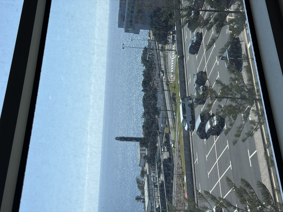 - "A view from a window shows a parking lot with several cars, a road with trees alongside it, and the ocean" by FM-PcEqo1, licensed under CC BY 4.0