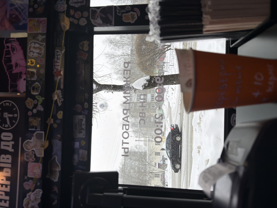 A view from inside a building shows a snowy street through a window. A black car is driving on the street. The window has Russian text on it, and there is a coffee cup and a machine in the foreground. The left side of the window frame is covered with stickers and posters. It appears to be snowing outside.