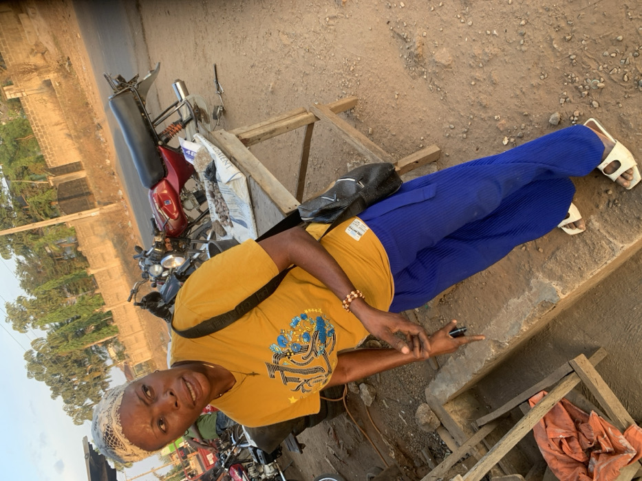 A woman wearing a gold shirt, blue pants, and white sandals stands beside a roadside setting with a motorcycle, a small wooden structure and a bag. She is wearing a head covering and has a beaded bracelet. She appears to be holding something in her hand. The background shows an outdoor scene with trees, buildings, and a road.