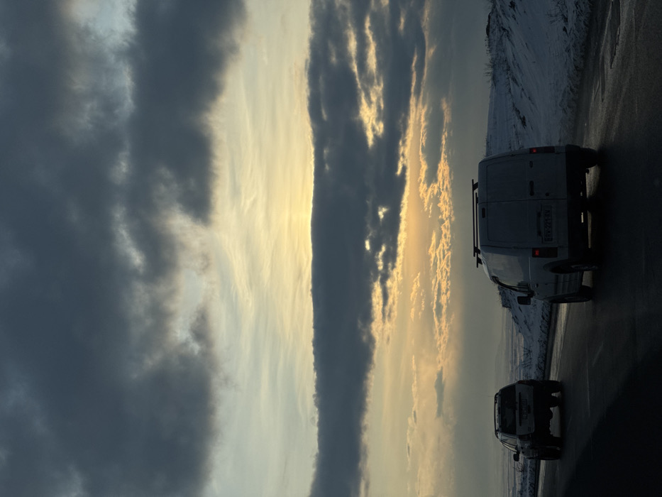 The image presents a late afternoon or early evening road scene in Jraber, Armenia, under a heavily clouded sky with a visible sunset. Two vehicles are observed traveling on a wet, paved two-lane road. In the immediate foreground, a white panel van, fitted with a black roof rack, moves away from the viewer. Its rear license plate is partially discernible as "EW 221 NV". Further along the same road, a dark-colored sport utility vehicle (SUV) also proceeds away from the camera. To the right of the roadway, the terrain is covered in snow, forming gentle, undulating banks. The distant horizon to the left reveals a vast, flat, or gently rolling landscape under a hazy sky. The upper portion of the frame is dominated by dark, dense stratocumulus clouds, while a horizontal band of golden-yellow light from the setting sun is visible between cloud layers near the horizon, casting an orange glow. No individuals are visible.