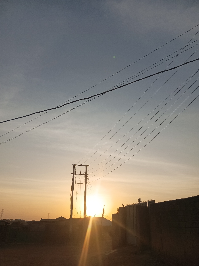 The image depicts an outdoor scene at either sunrise or sunset in Jos, Nigeria, characterized by heavy backlighting from a low sun. The sky transitions from a light blue at the zenith to a warm orange and yellow near the horizon. The sun, positioned slightly left of center and low on the horizon, emits intense golden light and generates a pronounced lens flare extending downwards and to the left. Numerous dark, thin overhead power lines crisscross the upper and middle portions of the frame, with one thicker cable running diagonally from the upper left. A prominent, silhouetted utility pole, likely constructed of wood or concrete with visible cross-arms and insulators, stands in the midground, directly in front of the sun. The immediate foreground consists of dark, unpaved ground. To the right, a dark, solid wall, appearing to be masonry, extends diagonally into the frame, topped with security spikes or barbed wire. A gate is integrated into this wall structure. In the distant left background, several high-voltage power transmission towers are faintly discernible against the atmospheric haze. No discernible human figures or active vehicles are present within the scene.