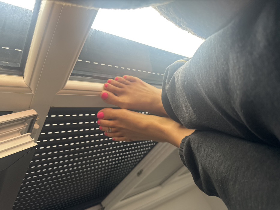 The image captures an interior scene in Nogent-sur-Marne, France, viewed from a low perspective. A pair of bare human feet, positioned centrally and slightly elevated, are the primary subject. The skin of the feet exhibits a warm tone. All visible toenails are painted a vibrant hot pink. A metallic, multi-band toe ring is present on the second toe of the left foot. The individual's lower legs are partially visible, covered by dark grey or black sweatpants, which display minor fabric pilling. In the background, a white-framed window is visible, with a partially lowered dark-colored roller shutter on the left side, featuring small, horizontal light-colored slits. The right portion of the window displays an overexposed bright white area, indicating strong ambient light from outside. The feet appear to be resting or elevated towards the window.