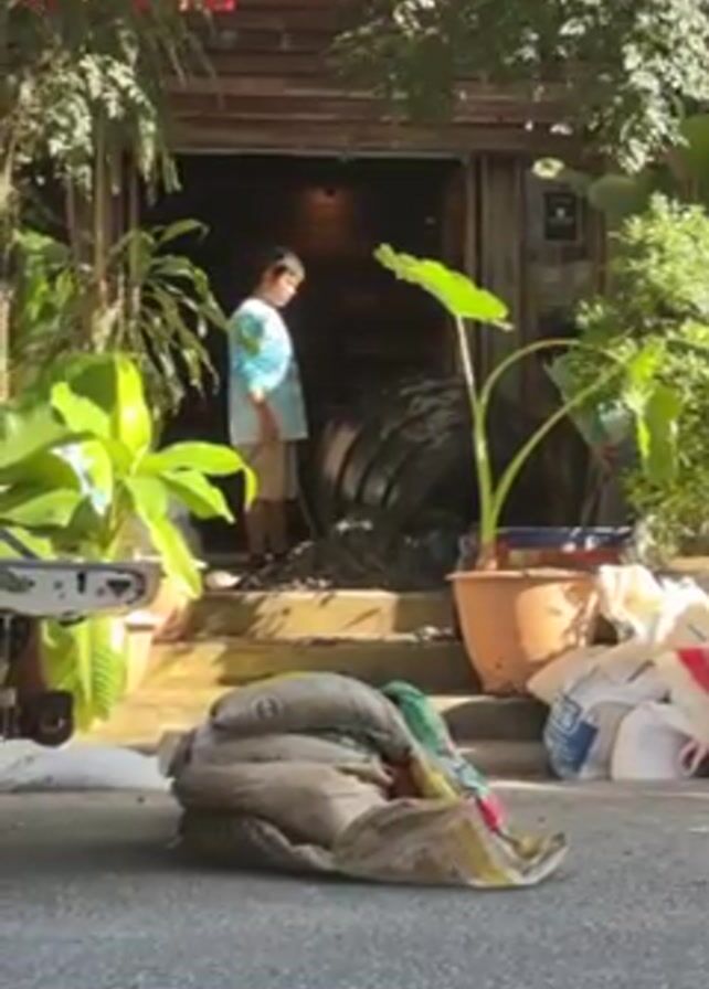 scene outside a building, likely a house or a shop, with sandbags in the foreground on the street. A young boy wearing a light blue shirt and khaki shorts is standing on the steps leading up to the building, looking at something inside. Another person, possibly an adult, is partially visible on the right side of the frame, also on the steps. They appear to be working with something inside the building. The building has a rustic, wooden facade with plants and greenery around the entrance. There's a pickup truck parked on the left side of the frame, with its tailgate partially visible. The day is bright, and shadows indicate that the sun is shining.