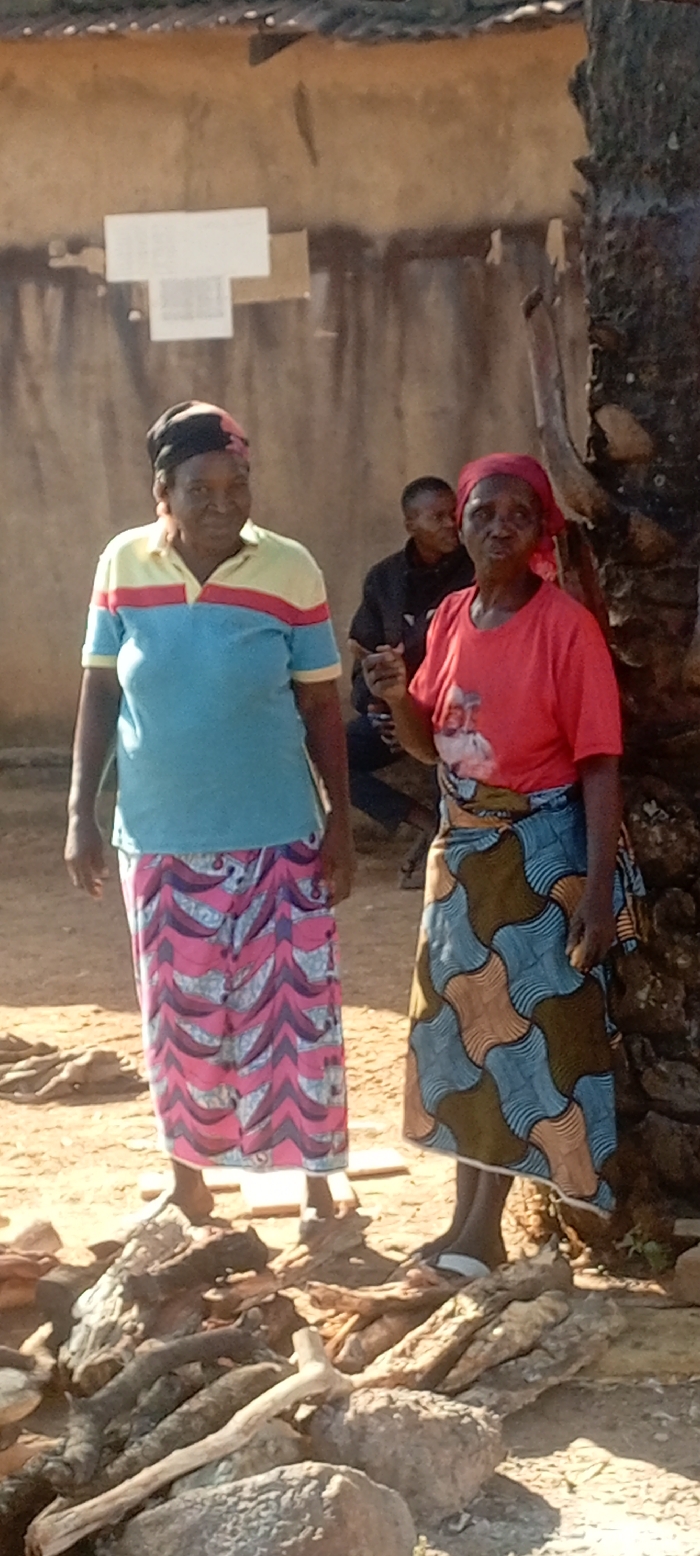 The scene is set outdoors in Kachia, Nigeria, depicting four individuals in an arid, dusty environment against a backdrop of a building. In the foreground, two adult women stand. The woman on the left wears a light blue collared shirt with yellow and red horizontal stripes, a pink and purple patterned long skirt, and a dark headwrap. She faces forward with a slight smile. The woman on the right wears a red t-shirt with a faint graphic print on the chest, a patterned wrap skirt in shades of blue, brown, and orange, and a red headscarf. She also faces forward, with her left hand slightly raised and clenched, positioned next to the rough, dark trunk of a tree. In the midground, partially obscured behind the women, a younger male wearing dark clothing is seated or kneeling. A fourth individual, possibly female, with a red head covering, is partially visible behind the second woman. The ground consists of light brown dirt with scattered rocks and pieces of wood/branches. The background features a light brown, possibly mud or plaster, wall of a building, with a dark corrugated metal roofline visible above. Two rectangular light-colored objects, appearing to be pieces of paper or cardboard, are affixed to the wall to the left of center, one slightly overlapping the other.