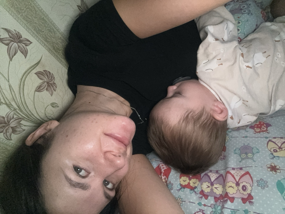 An indoor scene depicts an adult female and an infant in Красный Маяк, Russia