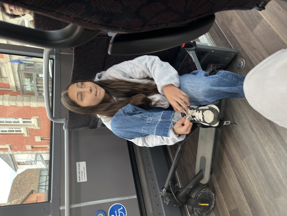 The image depicts the interior of a public transport vehicle, likely a bus or tram, with an exterior view of Lampertheim, France, through the window. A young female, appearing to be a pre-teen or early teenager with long dark hair and light eyes, is seated, wearing a light grey hooded sweatshirt with frayed cuffs and loose blue jeans. She is actively tying the laces of her left athletic shoe, which is predominantly white with black and grey accents. A black electric scooter is parked on the wood-patterned floor next to her, positioned beneath her left leg. The vehicle's interior features dark grey upholstered seating, a grey wall panel with a blue wheelchair accessibility symbol, and a French notice stating, "Veuillez céder cet espace à un passager en fauteuil roulant" (Please yield this space to a passenger in a wheelchair). Outside the window, a prominent red brick building with white window frames and multiple windows is visible, bearing the inscription "MAIRIE," indicating it is the Town Hall of Lampertheim. Adjacent to the Town Hall, a traditional building with a brown tiled roof and half-timbered facade is partially visible. In the upper right background, a male passenger with dark, curly hair and glasses is partially observable. The foreground shows the legs of another individual, presumably the photographer, wearing light-colored pants.