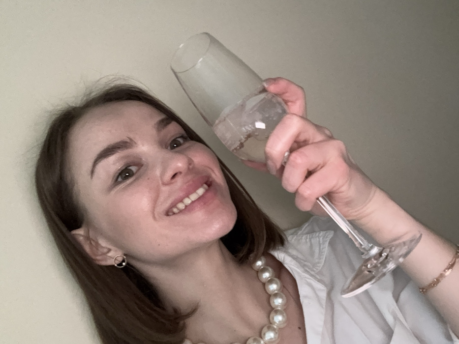 An adult female is depicted indoors, positioned at an upward angle, smiling with her upper teeth visible and her head tilted slightly to the left. She has light-toned skin, brown hair, and brown eyes. Her attire includes a white collared shirt, a large pearl necklace, and small circular gold-toned earrings. A gold-toned chain-link bracelet is visible on her right wrist. In her right hand, she holds a clear, stemmed glass, possibly a champagne flute, tilted to the right. The glass contains a clear liquid, ice cubes, and two clear plastic straws. The background is a plain, light-colored wall. No specific location within the city of Warsaw, Poland, can be determined from the visual evidence.