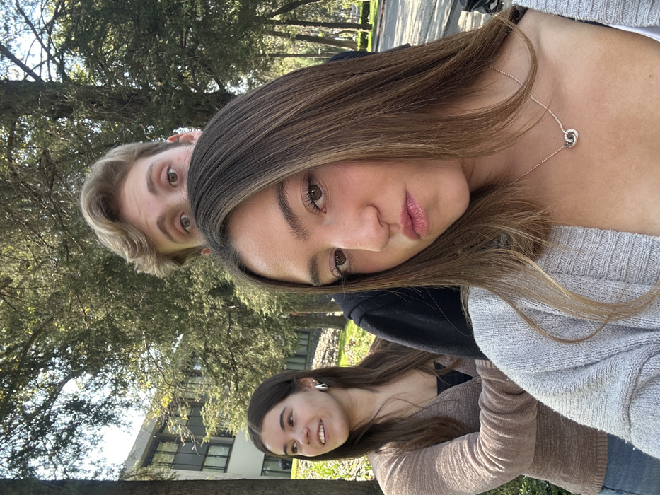 Three young people pose for a selfie outdoors. The focus is on a girl with long brown hair, wearing a grey sweater and silver necklace. Peeking behind her is a fair-skinned boy with blond hair, his eyes wide with surprise. A third girl, also with brown hair, smiles slightly in the lower part of the frame. Trees and a building are visible in the background, indicating a park or campus setting on a sunny day.