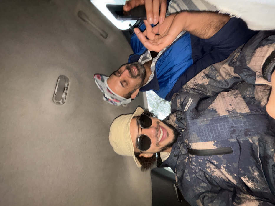 The image displays two adult males seated inside a vehicle, likely in Tétouan, Morocco