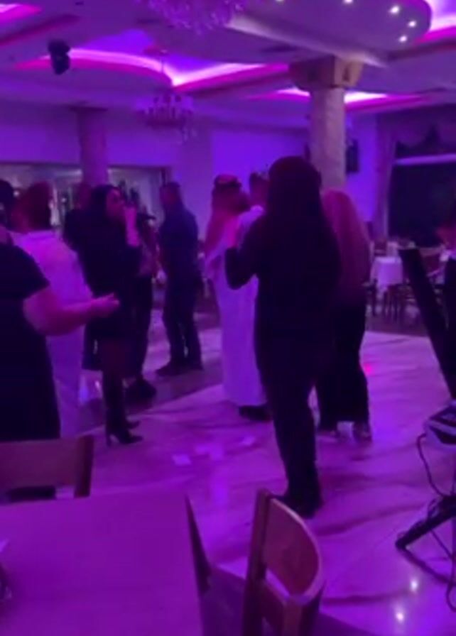 A sparsely-furnished banquet hall is illuminated with neon purple lights, and several people are dancing on the light-colored patterned floor. In the center of the room, one person is wearing a white robe and a headdress. Other guests are dancing around them, some clapping and singing. White paper scatters the floor, and tables with chairs are arrayed along the edges of the room. A chandelier hangs overhead.