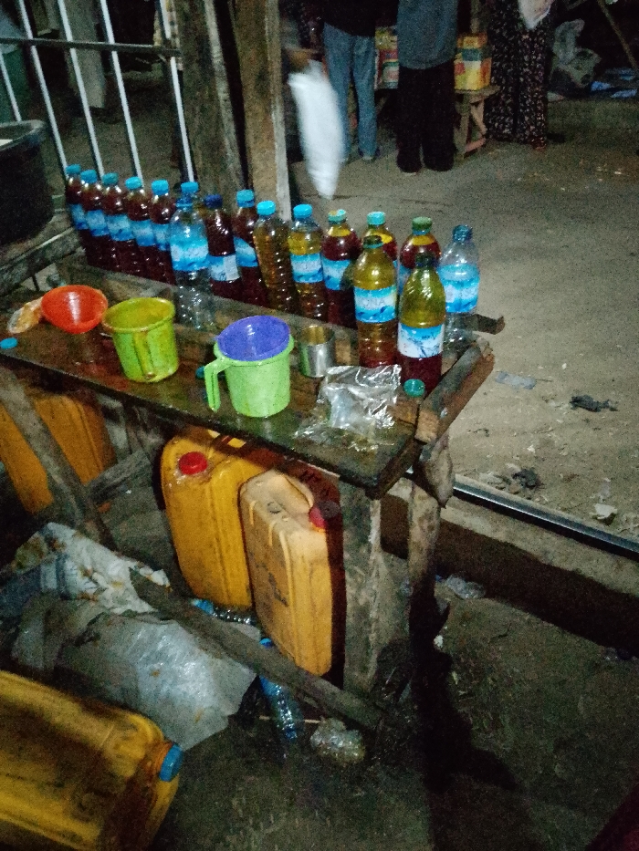 A makeshift table displays an array of bottled liquids, likely for sale. The bottles are filled with reddish-brown and yellow liquids, some labeled with blue caps. Colorful plastic mugs and a small metal cup sit on the table's surface. Below, yellow jerrycans are stored amidst debris and a plastic bag. The table, constructed from rough wooden planks, appears to be set up in an outdoor market setting. People are seen in the background, suggesting a bustling environment.
