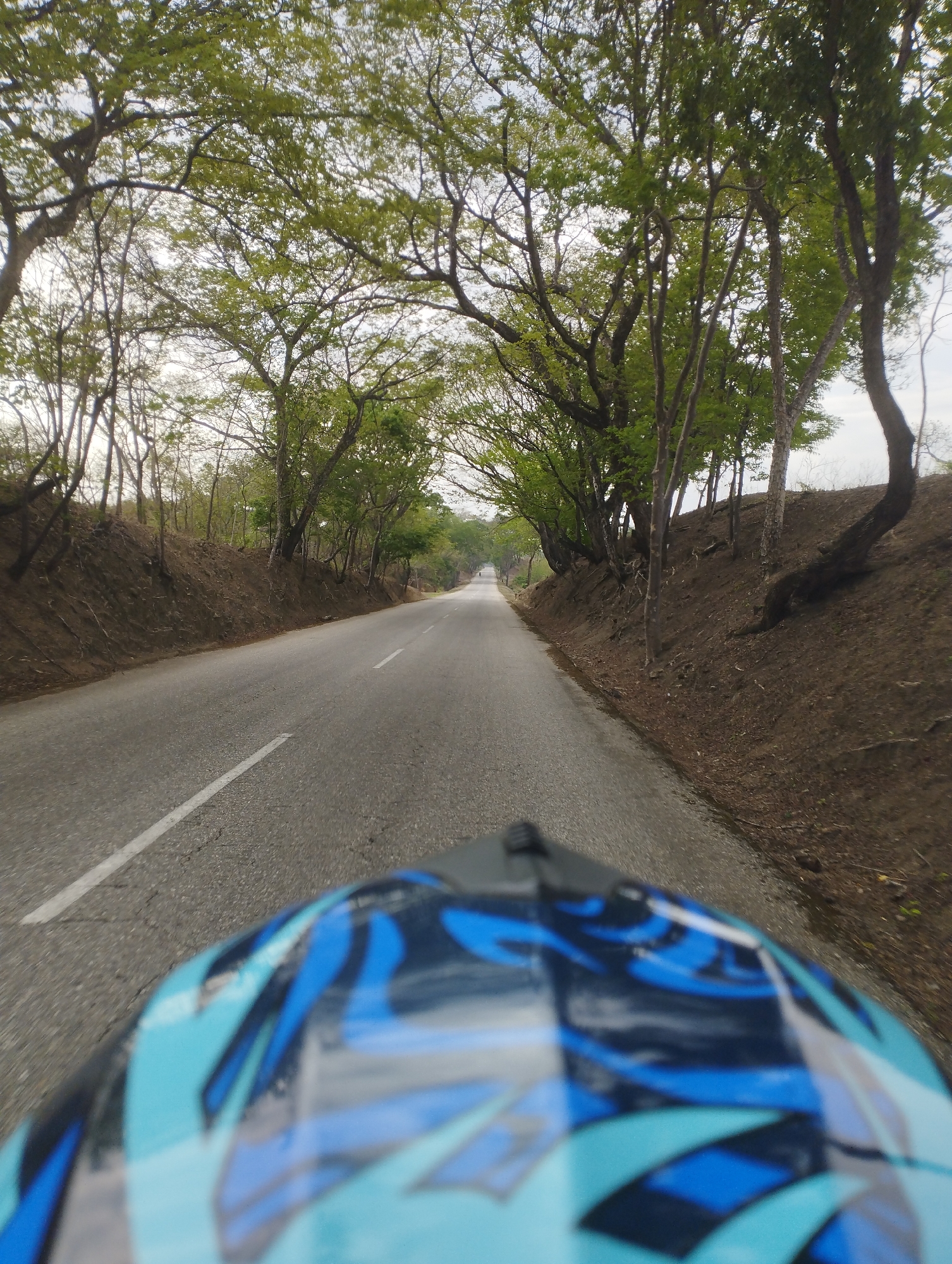 A first-person perspective photograph shows a view from a motorcycle helmet, looking down a paved road lined with trees, likely in the vicinity of Ortiz, Venezuela. The road stretches into the distance, with the trees forming a canopy overhead. The shoulder of the road is composed of dirt. A white line marks the edge of the lane. The motorcycle helmet is in the foreground, showing a blue and black design.