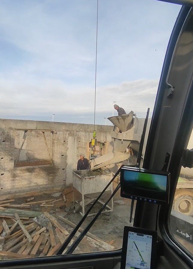 From inside a crane cabin, a view of a construction site is visible through the windshield