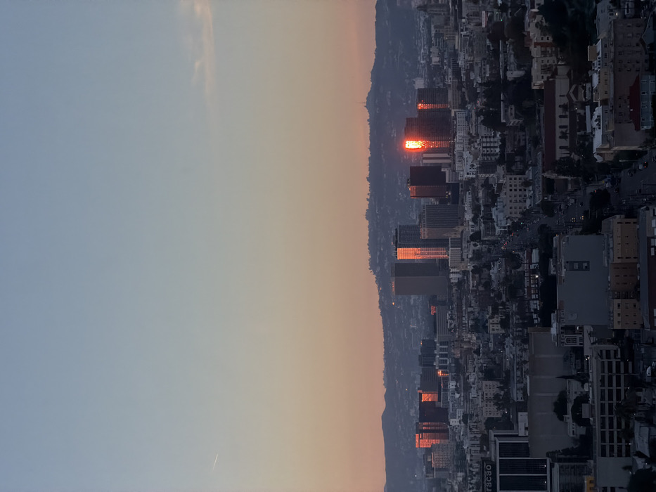 An aerial view captures a cityscape meeting a fading sunset. Buildings are tightly clustered, their windows reflecting a fiery orange glow. Mountains form a backdrop, silhouetted against the horizon where the sky transitions from orange to pale blue. An airplane trail cuts through the upper left corner. The overall scene evokes a sense of urban density bathed in the warm light of twilight.