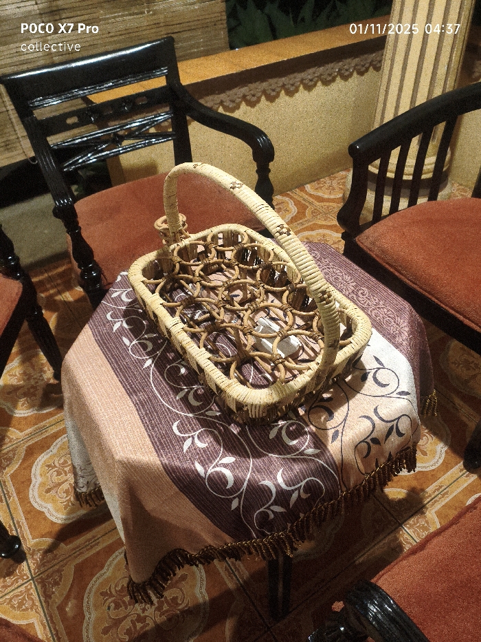 A light-colored rattan or wicker basket with an arched handle and a patterned, compartmentalized interior base rests on a small table. Inside one compartment of the basket is an unidentifiable small white object. The table is draped with a patterned tablecloth featuring dark brown and beige stripes adorned with white scrollwork, finished with a dark fringed trim. The scene is set indoors, on a tiled floor displaying orange, brown, and beige geometric and floral patterns. Two dark-stained wooden chairs with reddish-brown upholstered seats are partially visible to the left and right of the table. In the background, a light-colored wall or partition with a dark, scalloped decorative trim is present. No individuals, direct actions, or interactions are observed. This scene is located in the city of Pacet, Indonesia. Image metadata indicates "POCO X7 Pro collective" and a timestamp of "01/11/2025 04:37".