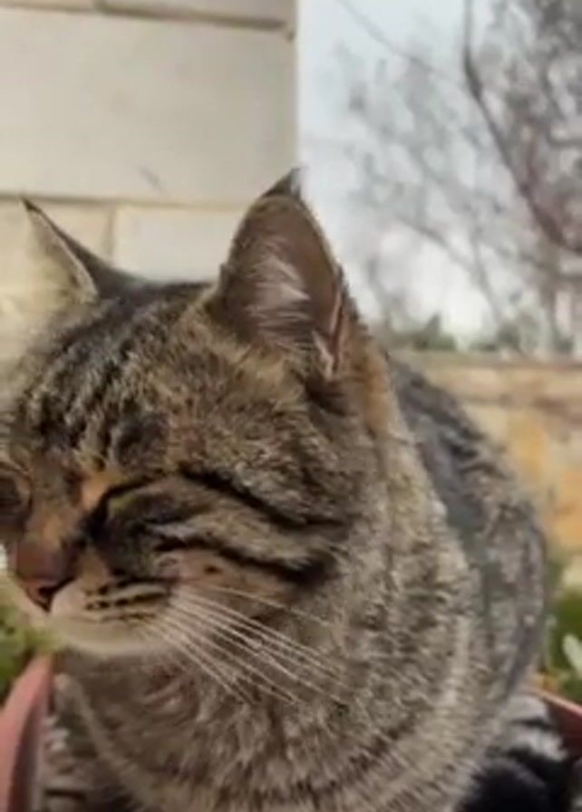 close-up of a tabby cat sitting in a flower pot. The cat is gray and brown with dark stripes. It has green eyes and a pink nose. The cat looks directly at the camera and then glances to the side. The background is blurry, but it appears to be an outdoor setting with a building and some trees.