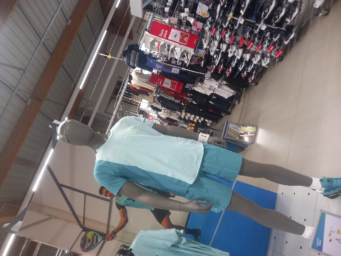 The image displays the interior of a sporting goods retail store in Vendin-le-Vieil, France. In the foreground, a grey, headless mannequin stands centrally, facing slightly right. It is attired in a light blue and white color-blocked short-sleeved athletic shirt, light blue athletic shorts, white athletic socks, and light blue athletic shoes accented with yellow. A white wristband is present on its right wrist. A partial product display stand is visible near the mannequin's left foot, and a small, illuminated rectangular display is positioned on the floor behind its lower legs. In the mid-ground to the left, a male individual with dark hair wears a teal athletic t-shirt and dark shorts. He is captured in a dynamic pose, holding a green and black padel racket with a yellow ball on its face, extended upwards with his right arm, simulating a serve or overhead shot. He stands on a blue mat marked with white lines, indicative of a court section. The background on the right side of the frame features extensive retail shelving and racks densely stocked with athletic apparel and footwear. Numerous rows of athletic shoes, primarily in white, black, and dark blue, are displayed on shelves. Clothing items hang on racks. Red signs bearing white text, one partially visible as "Bons plans," are interspersed among the merchandise. The store's environment includes a light-colored floor, a high ceiling with exposed wooden beams and metal roofing, and fluorescent strip lighting fixtures. Additional merchandise displays are present in the deeper background to the left.