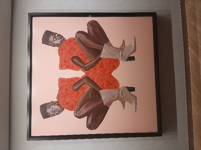 The image depicts a large, framed painting centrally mounted on a plain light grey wall. The artwork features two mirrored, dark-skinned figures in a squatting or crouching pose. Each figure wears a voluminous, textured red garment covering the upper body and upper legs, with an inverted, irregular peach-colored gap between them where the mirroring occurs. Their faces are marked with prominent white designs, particularly around the eyes, and they exhibit tall, dark flat-top hairstyles. Both figures wear light beige ankle boots with distinct dark block heels. The painting's background is a solid pale peach color, and it is enclosed within a thick black frame. A lighter grey baseboard is visible below the painting, and the floor is composed of light brown wooden planks. The precise location within the city of Hong Kong, China, cannot be determined from this image.