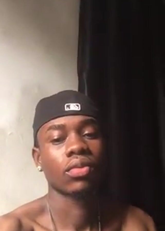 A medium close-up shows a young, shirtless Black man wearing a black baseball cap with a white MLB logo