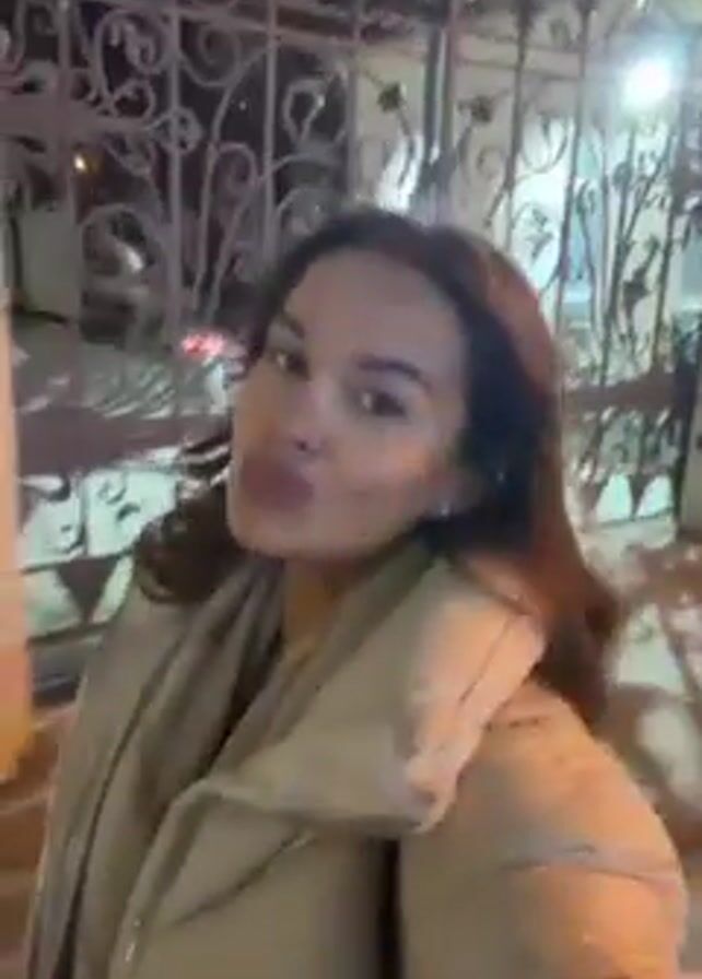 A woman is taking a selfie video in front of a building at night. She is wearing a beige puffer jacket and has long brown hair. She makes kissing faces toward the camera as she walks by a building. The building is large, ornate and lit up. There is a metal fence in front of the building.