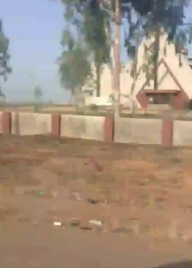 The video depicts a building with a unique architectural design, consisting of multiple pyramid-shaped structures. The building is situated behind a low, concrete wall punctuated with reddish-brown posts. The foreground is characterized by arid, reddish-brown dirt and sparse vegetation. Trees with sparse foliage are scattered around the building, partially obscuring the view. A person walks along a path on the right side of the frame early in the video. The sky is clear and blue. The camera appears to be in motion, likely from inside a moving vehicle.