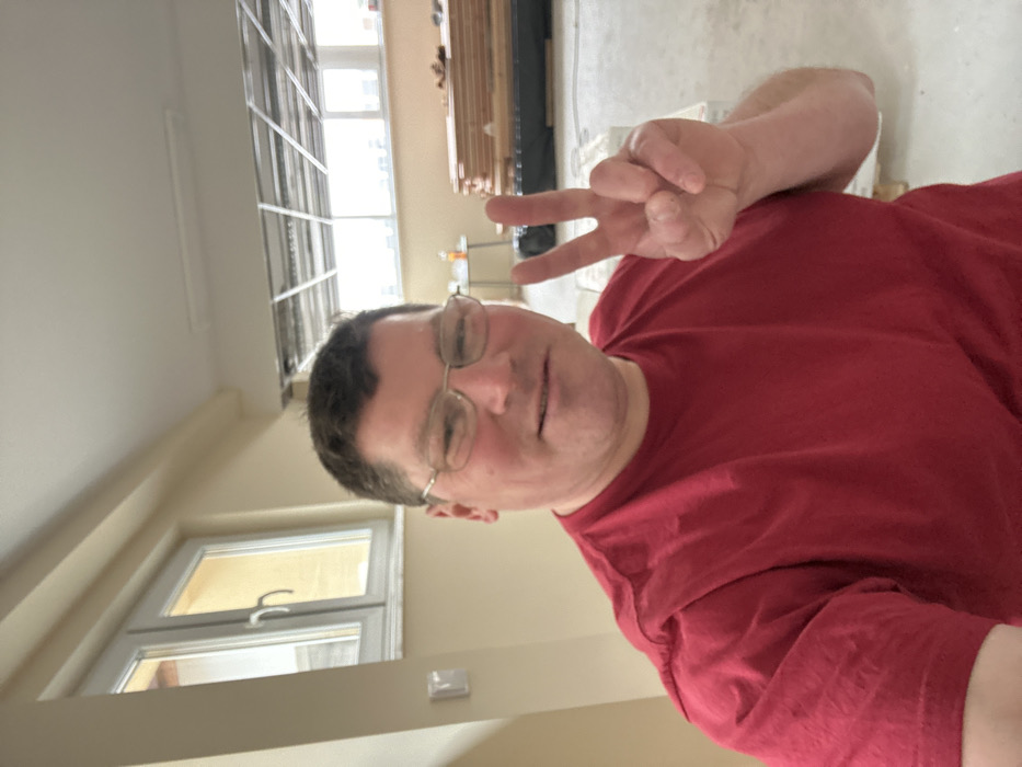 The scene is located indoors within the city of Stara Zagora, Bulgaria, depicting a single adult male in what appears to be a room undergoing construction or renovation. The man, approximately middle-aged with short dark hair and clear-framed eyeglasses, is wearing a plain red short-sleeved t-shirt. He is smiling and looking directly towards the camera, with his right hand raised, forming a "peace" sign (V-sign) with his index and middle fingers extended. The background features light-colored walls, possibly beige or pale yellow. To the left, a white-framed window allows natural light into the space. A white electrical fixture or switch is mounted on the wall below the window. To the right of the subject, the room contains stacks of wooden planks, a roll of black material, and several white boxed items, suggesting construction materials. A small table with an orange bottle is visible in the mid-ground. The floor appears to be an unfinished concrete surface. The ceiling in the background reveals exposed metal framework, indicative of a suspended ceiling system under installation.