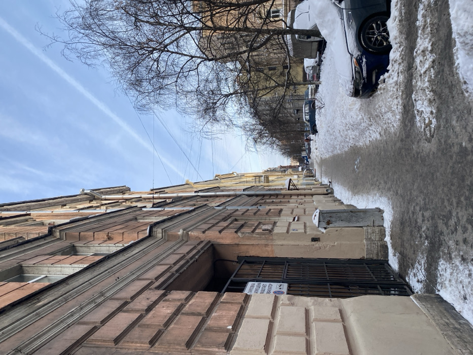 An urban street scene in Saint Petersburg, Russia, is depicted during winter. The primary focus is a narrow, snowy street flanked by multi-story residential buildings under a clear blue sky marked by white contrails. On the left, a light reddish-brown building with rusticated stone blocks on its lower facade extends into the distance. A dark metal gate is partially open into an entrance, displaying a white sign with black text in Russian, which translates to "Parking is prohibited. A tow truck is operating." Adjacent to the gate, a weathered concrete bollard protrudes from the snow-covered ground. The sidewalk directly in front of the building is mostly clear but shows patches of packed snow and ice. The street itself is heavily covered in dirty snow, forming significant drifts along the curb. Numerous bare deciduous trees line the right side of the street, intermingled with more multi-story buildings of varying colors, including pale yellow and light brown, receding into the background. Several vehicles are parked along the right curb, largely obscured by snow accumulation; a blue sedan is prominent in the foreground, with its front end partially buried in snow, and a white commercial van or truck is visible further down the street, also snow-covered. In the far distance, a single human figure is discernible on the right sidewalk. Overhead utility wires crisscross the frame against the bright sky. The overall impression is a cold, quiet winter day in a historic urban environment.