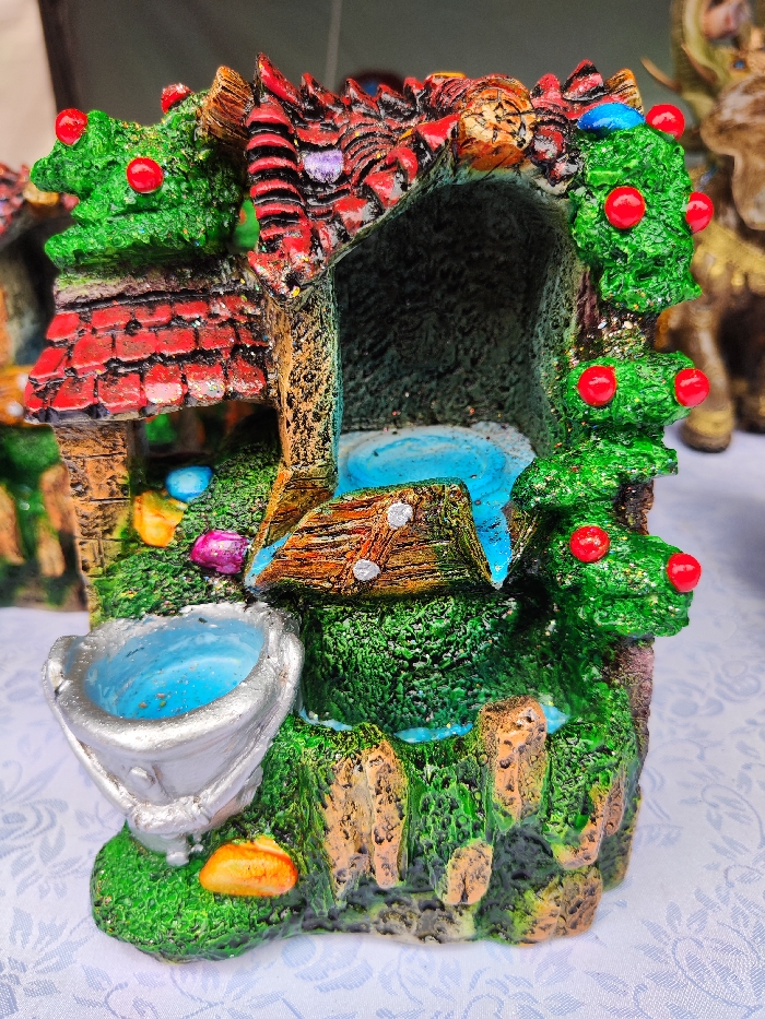 A whimsical water fountain ornament is showcased. It features a grotto-like structure with a red-tiled roof, green foliage dotted with red berries, and an opening that reveals blue, simulated water. The water appears to flow from the opening, over a textured, wooden-like ledge, and into a small, bucket-shaped receptacle at the base. The ornament is heavily textured and brightly colored, suggesting a playful, fantasy-inspired design.