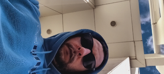 A person wearing a blue hoodie and sunglasses looks down at the camera. The background features a white, tiled structure with small, round lights and a glimpse of blue sky with clouds in the upper right corner. The hoodie has white lettering or design elements on the left side. The image is angled, creating a slightly disorienting perspective.