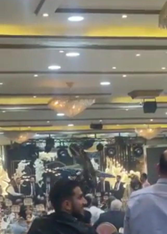 man performing a traditional Sufi whirling dance in a decorated hall, likely during a celebration. The room is spacious and well-lit, featuring ornate chandeliers, patterned walls, and a stage at the end. The stage is decorated with flowers and illuminated by multiple spotlights. In the foreground, a group of people, predominantly men, are seated at tables, watching the performance. The dancer is wearing a long robe that fans out as he spins, creating a visually striking effect. The camera is positioned among the audience, providing a low-angle view of the stage and the dancer. There is music playing in the background, adding to the festive atmosphere. The lighting, decorations, and attire of the people indicate that this event may be a wedding or a formal gathering.