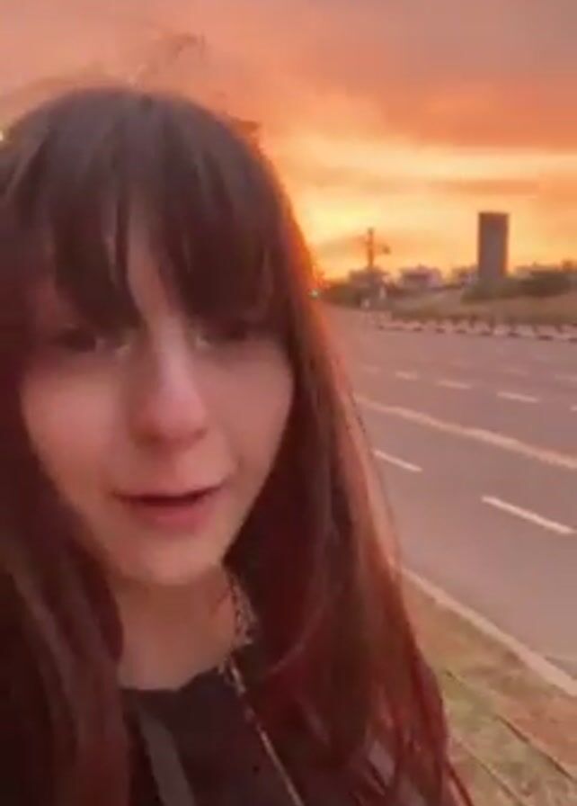 A person with dark hair and bangs, wearing a black top, is holding a phone camera up and recording themself at eye-level. They are standing next to a curb and a multi-lane road. Behind the road are various buildings and trees in the distance. The sky is orange and yellow, indicating it is either a sunrise or sunset. The person speaks into the camera, then opens their mouth wide and appears to scream.