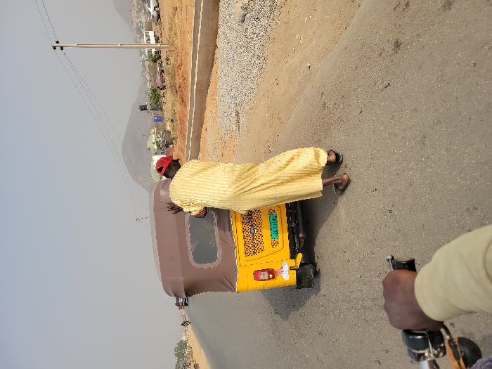 The scene depicts an outdoor roadside in Suleja, Nigeria, under a hazy, light-colored sky. A male individual, appearing to be of dark complexion, is positioned behind a yellow and brown three-wheeled commercial tricycle (Keke Napep) on an asphalt road. He wears a long, light-colored, possibly yellow, flowing garment and a red cap, with brown sandals on his feet. His hands are placed on the rear canopy of the tricycle, indicating an action of pushing or examining. The image is captured from the perspective of a person on a motorcycle, with a dark-skinned hand gripping a black handlebar and throttle visible in the lower left foreground. To the right of the road, a concrete curb separates the asphalt from a dirt shoulder where a significant pile of grey gravel is present. Beyond this, a wooden utility pole with multiple overhead lines stands against a backdrop of distant, arid hills. Scattered buildings, including a white passenger bus and other parked vehicles, are visible in the mid-distance on the right. To the left, the asphalt road extends into the distance, with several other vehicles, including cars and motorcycles, visible in motion or parked. The overall environment presents a dry, semi-urban landscape.