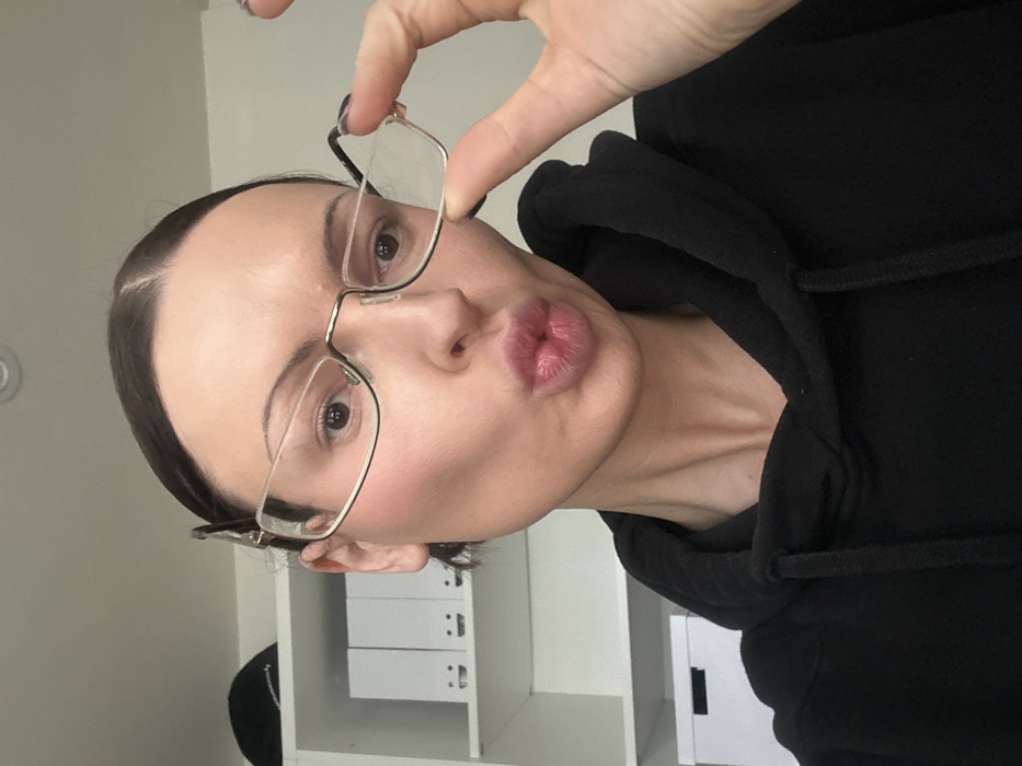 An adult individual is depicted in a close-up, frontal view, indoors within the city of Wealden, United Kingdom. The individual has dark hair pulled back and is wearing a black hooded sweatshirt. They are wearing clear-lensed, rectangular spectacles with thin gold-colored frames. The individual's lips are puckered in a forward gesture, and their eyes are open, looking directly at the camera. Their right hand is positioned to hold the right temple arm of the spectacles. In the background, a white shelving unit is visible. On one shelf, four white binders are aligned, each displaying a black smiley face icon on its spine. Above these binders, a dark, indistinct object rests on a higher shelf, and a white box is partially visible on a lower shelf. The environment appears to be an interior space with white walls.