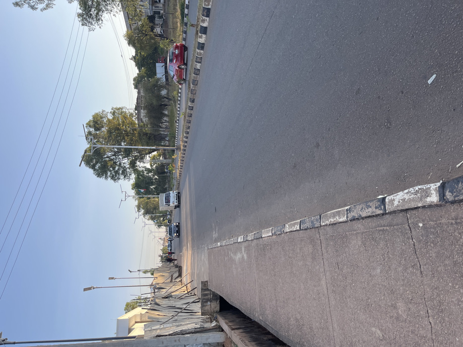 The scene depicts an urban street in Bar Jirgi Summa, Nigeria, under a clear blue sky, likely during daylight hours. On the left, a concrete sidewalk runs parallel to the asphalt road, featuring visible cracks and an open concrete drainage ditch. A temporary barrier, constructed from a series of leaning and upright corrugated metal sheets, lines the sidewalk. A utility pole stands on the far left. The asphalt road occupies the center, appearing multi-laned and delineated by a curb painted with black and white stripes. Vehicles observed on the road include a white panel van traveling away from the viewer in the right lane, a dark-colored sedan with headlights illuminated approaching the viewer in the left lane, and a red hatchback moving away from the viewer in the right lane, close to the central median. Additional vehicles are discernible in the distance. The central median contains small plantings and multiple streetlights equipped with solar panels, mounted on tall poles. A green and white flag, consistent with the Nigerian national flag, is visible on a pole within the median. Trees with green foliage line the median and the right side of the road. In the background, overhead power lines or communication cables crisscross the sky. Distant buildings are partially obscured by trees. Several pedestrians are observed walking on the concrete sidewalk in the far distance, near the corrugated metal barrier.