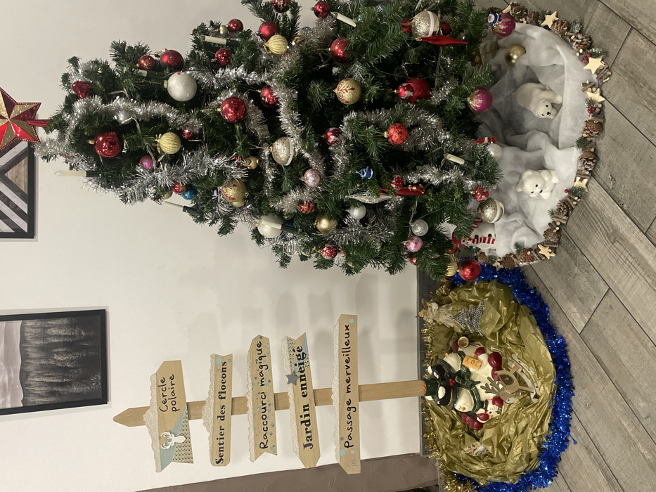 A decorated Christmas tree with red, gold, and silver ornaments, adorned with silver tinsel. A white faux-snowy base with polar bear figurines sits underneath the tree. A wooden signpost with French phrases pointing toward themed areas surrounds a separate display featuring penguins and reindeers on a golden background with blue garland. Two framed pictures hang on the wall above the signpost.